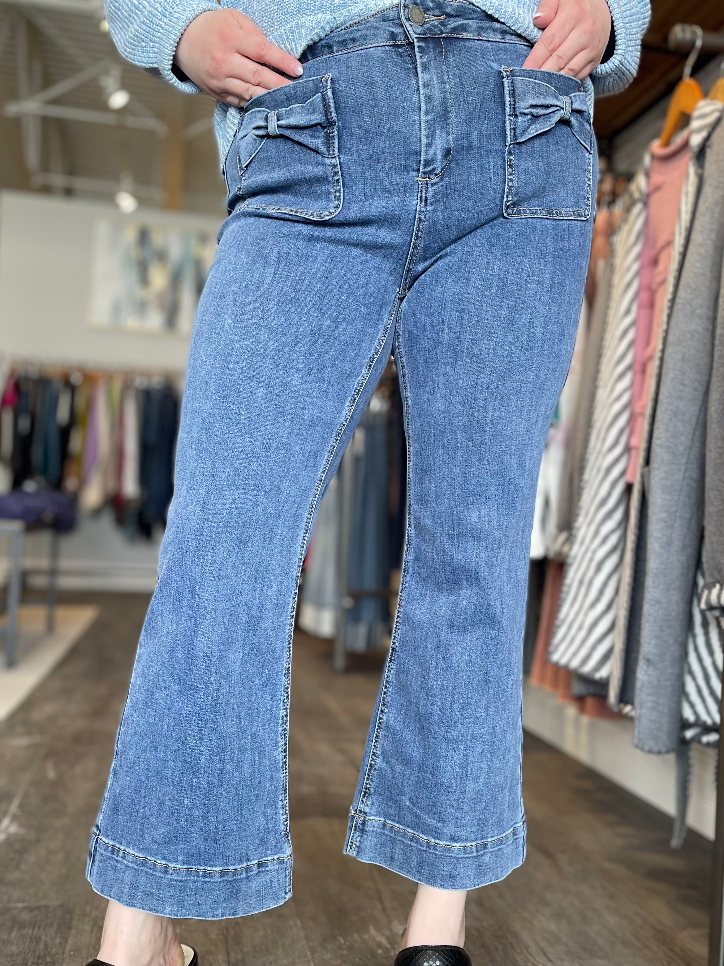 Flare Leg Stretch Denim Pants With Bow Patch Pockets