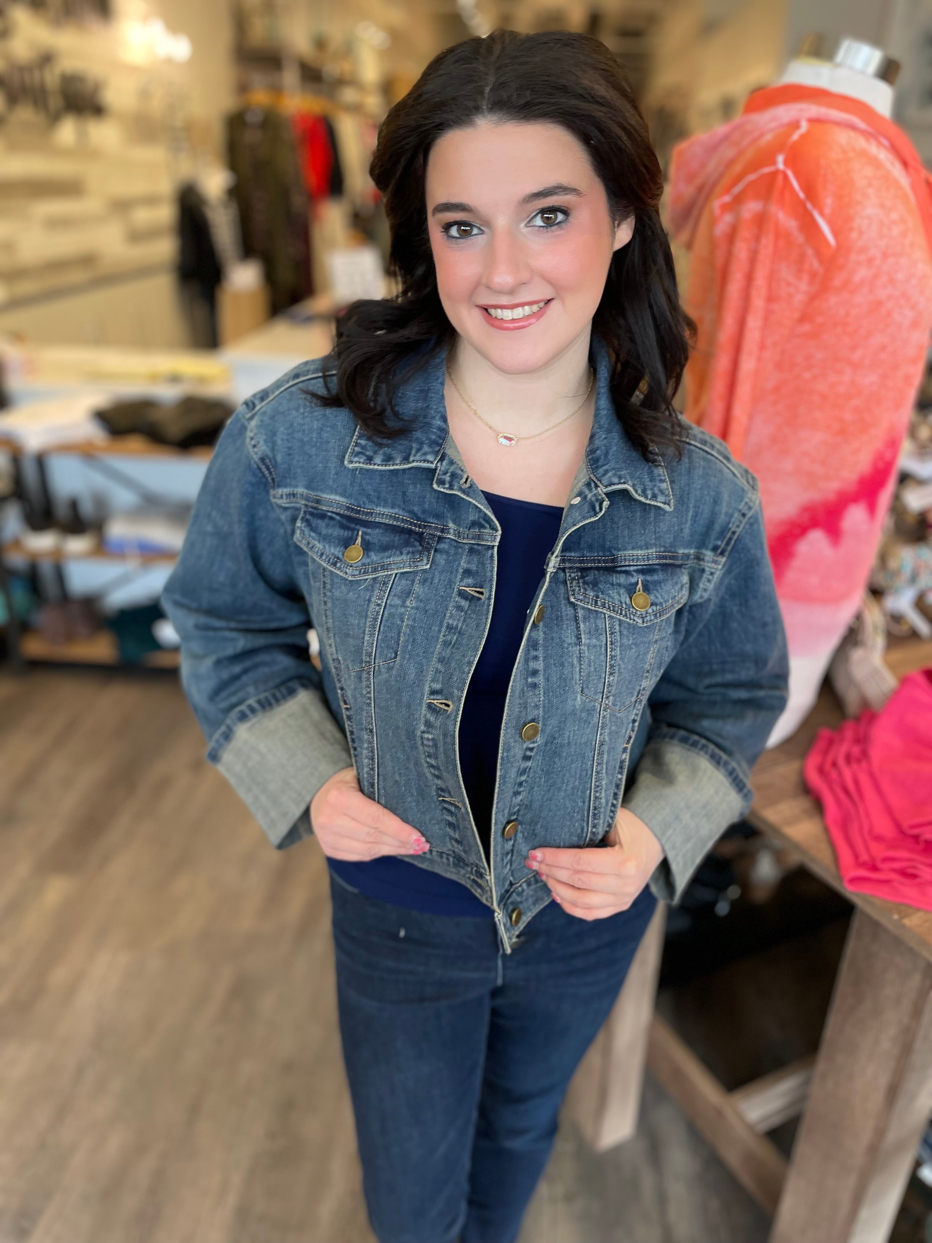 Elevate your wardrobe with this chic cropped denim jacket, a timeless piece that pairs effortlessly with any outfit. Featuring a structured silhouette and gold-tone buttons, this jacket brings a polished touch to casual ensembles. The standout detail is its stylish contrast cuff, adding a modern twist to the classic denim look. Crafted from high-quality, medium-wash denim, this jacket is as durable as it is fashionable. Perfect for layering over dresses, tees, or blouses, it’s a versatile staple you’ll reach for season after season!