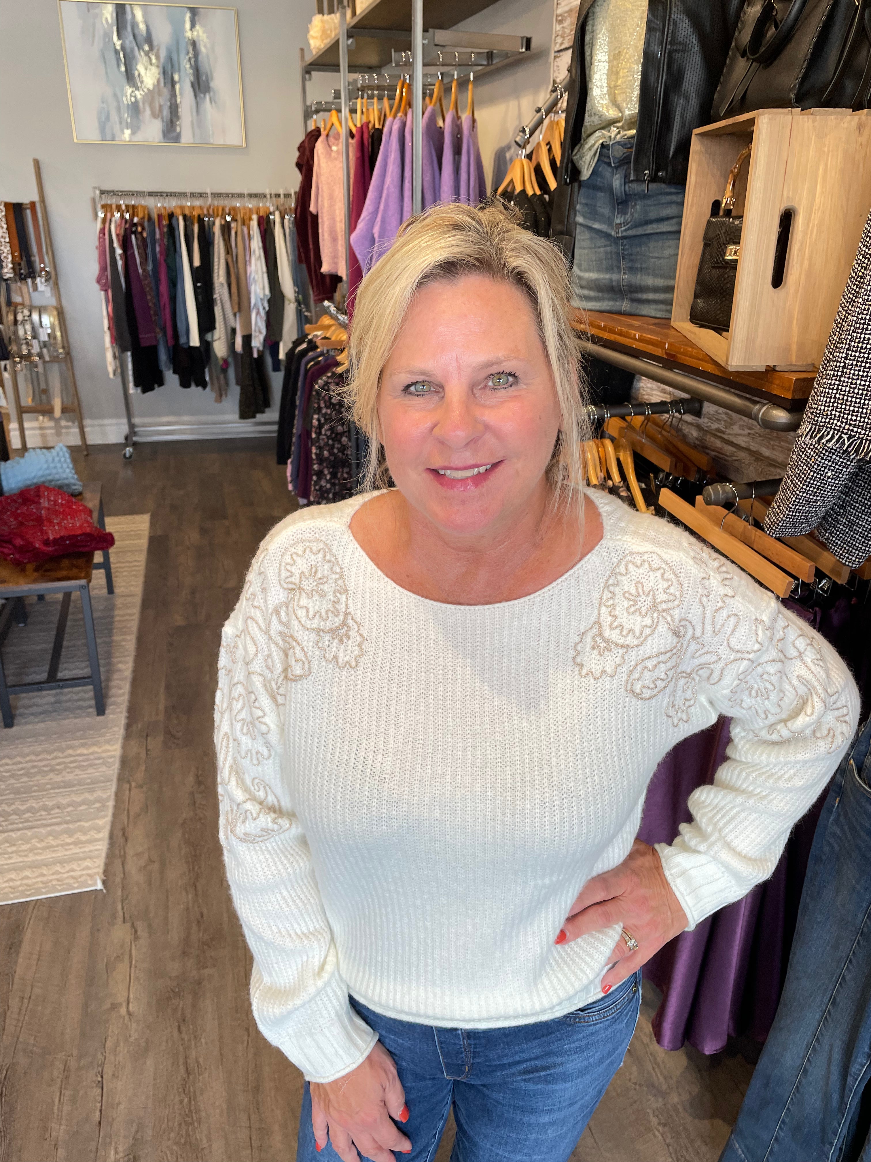 L/S Boat Neck Embroidered Sweater
