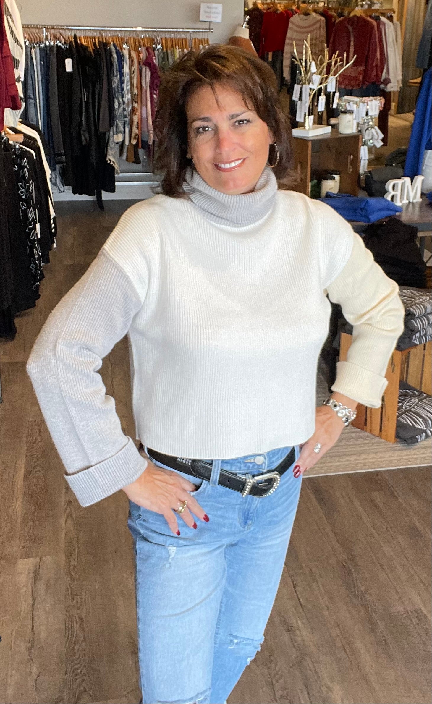 Elevate your winter wardrobe with this ribbed knit sweater. Featuring oversized cuffed sleeves, a boxy fit, and slouchy roll neck, this sweater exudes effortless style. The contrasting color block design and cropped length offers a modern twist on a traditional style.