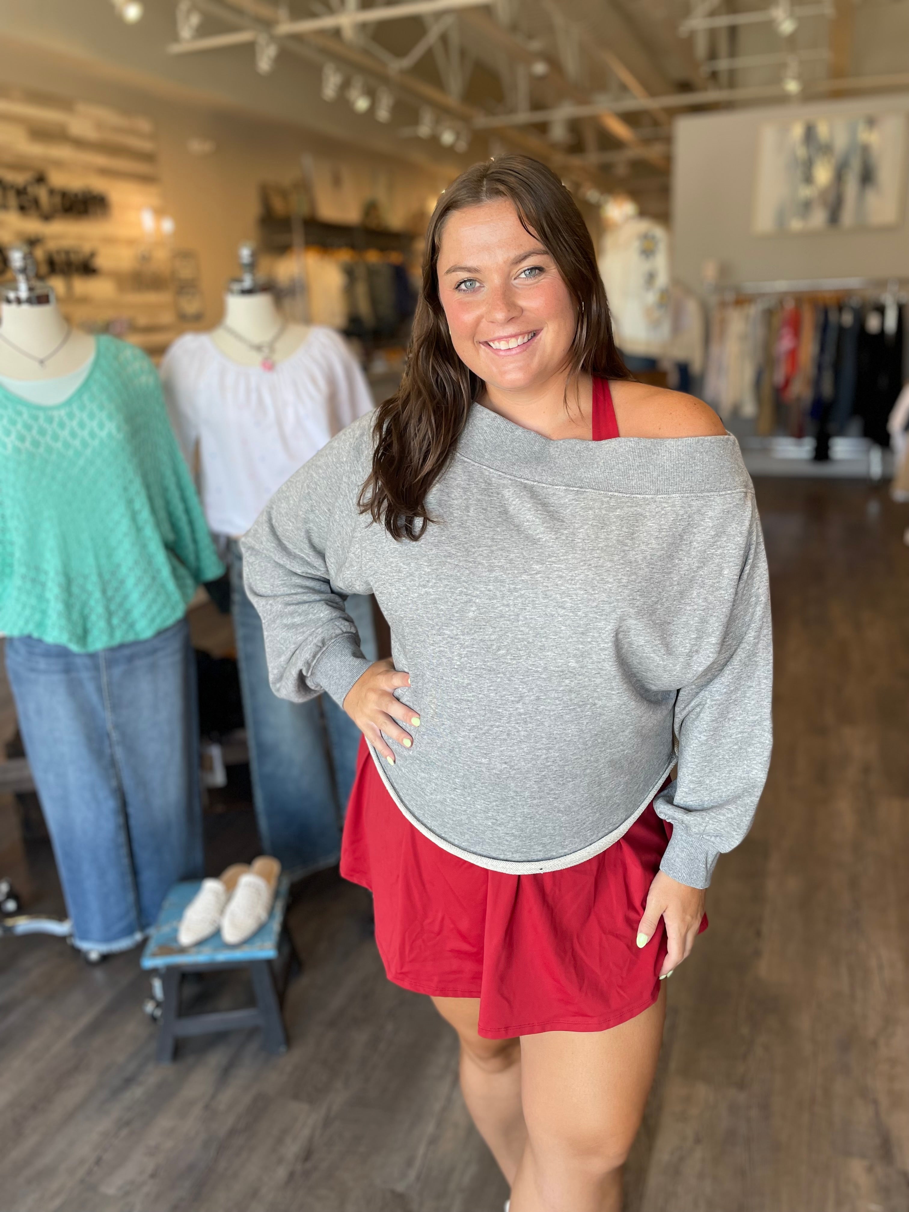 This off-the-shoulder French terry sweatshirt offers a fashionable and comfortable option, perfect for a chic casual look.