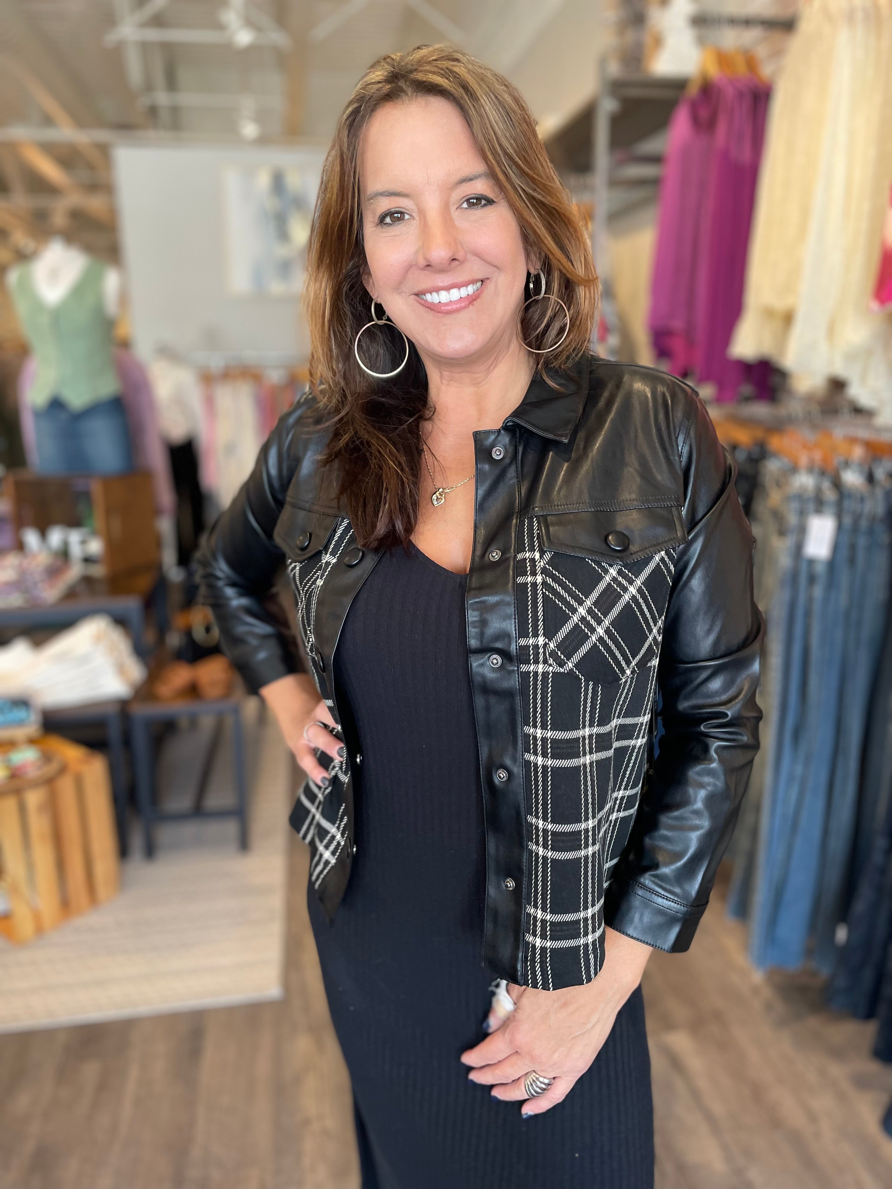 This sleek and stylish Shirt Jacket with contrasting fabric, where sophistication meets casual comfort. Crafted with meticulous attention to detail, this jacket boasts a unique fusion of faux leather and a black oatmeal plaid fabric. Its shirt-style design offers a relaxed yet refined silhouette, perfect for layering over your favorite ensemble. 23-1/2" Front body length. Boxy fit. Contrast sleeves. Button front closure. Two front chest flap pockets. Cuff detail with button closure. Windowpane plaid knit. Polyester, Rayon, Spandex.