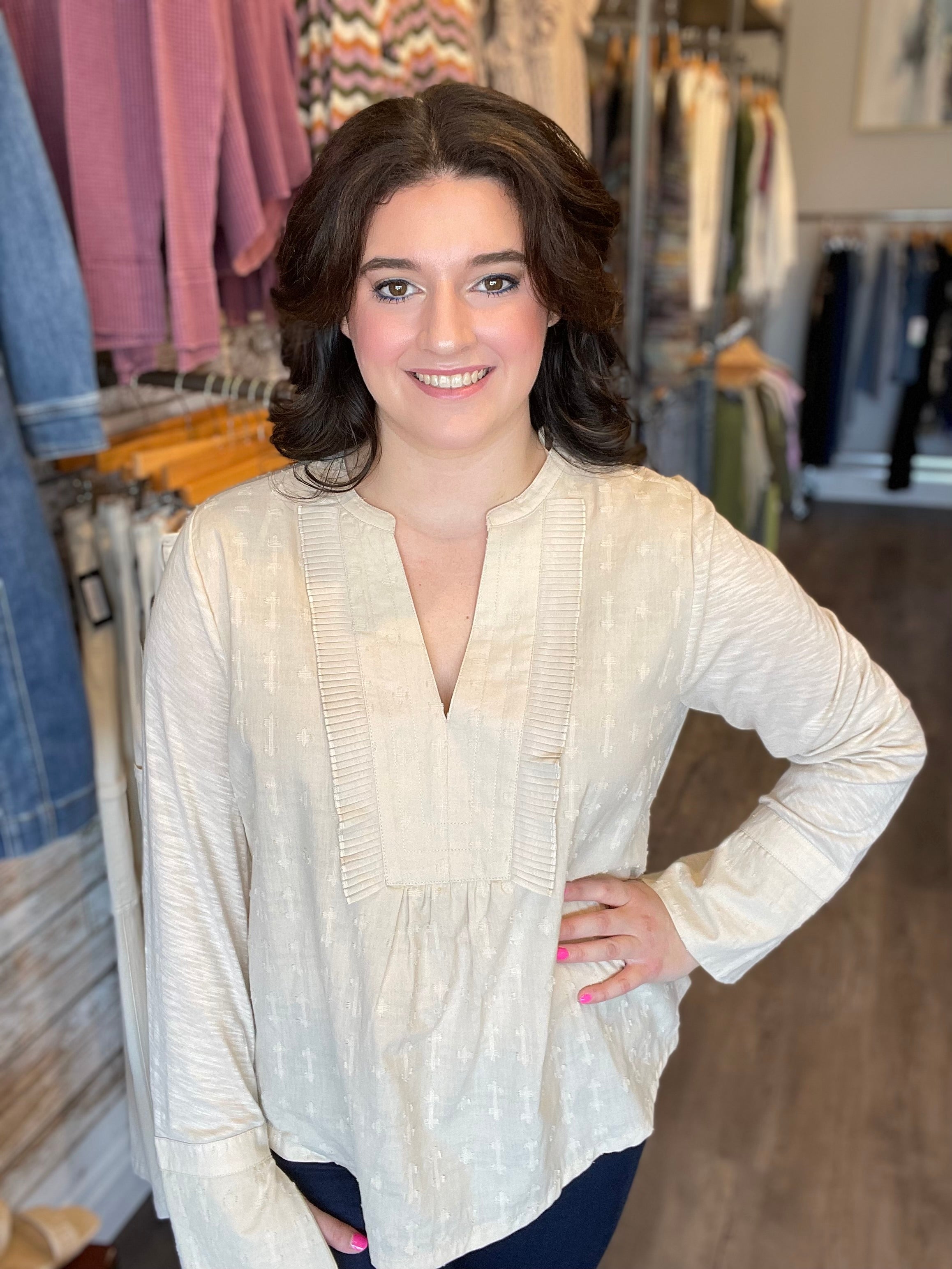 This unique piece features a modern stand collar and split cuff bands that add a touch of sophistication and elegance. The mix media design blends different fabrics seamlessly and the subtle embroidered detail adds texture.